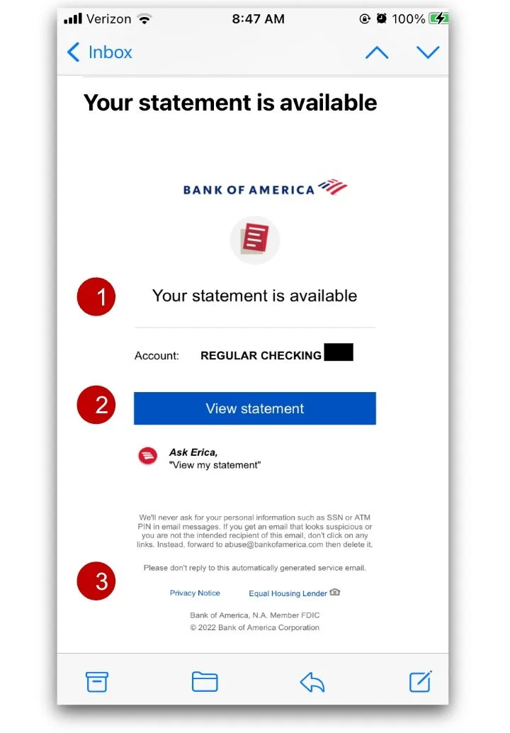Bank of America provides a concise email to the user when their bank statement is available.