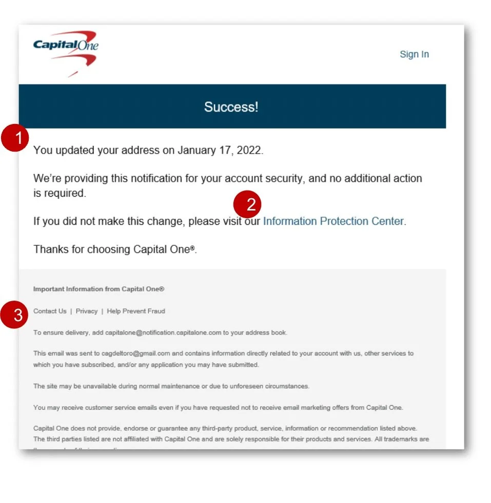 This is an email received after updating the address information in the Capital One account.