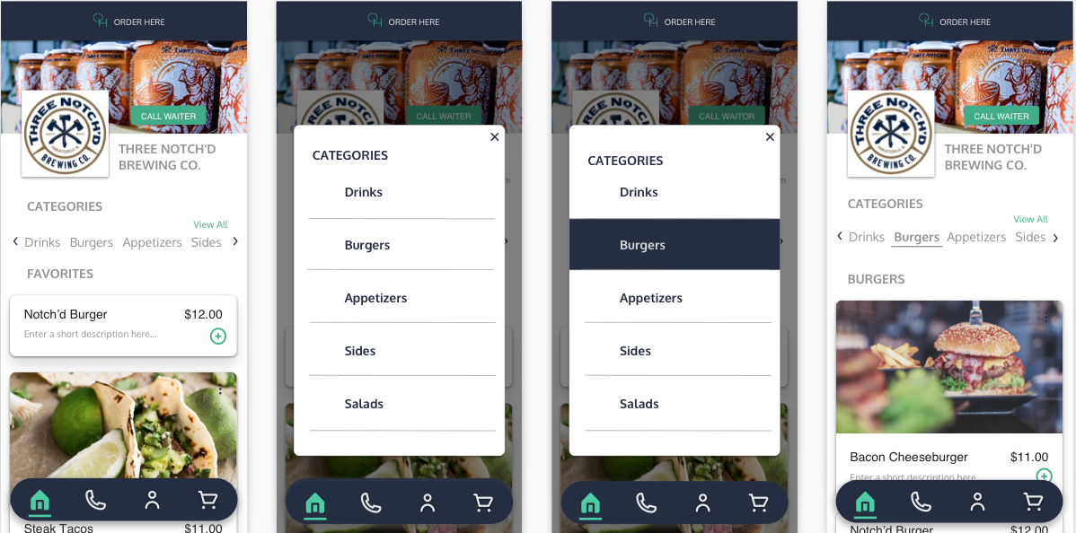 The mobile menu is where users can look through selections on the menu. They can choose categories to find what they are looking for quickly or just scroll. At the top of the page, they can see where they are in the ordering process.